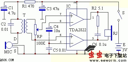 耳聋者的福音,这个耳聋助听器由TDA2822双功放集成电路加上少量外围元件组成,它与市场上的普及机相比具有输出功率大、电压范围宽等特点,工作电压为1.8—15V,适合中、轻度耳聋患者使用。