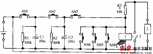 使用时依次按下AN1、AN2、AN3才能打开电器。关机只需按动AN4~AN2任一键即可。按下AN1时,电源对C1充电,按下AN2时C1对C2充电,按下AN3时,C2上的电压使用继电器J吸合并自保,负载L因此得电工作。国中R3为限流电阻,根据电源电压调整。