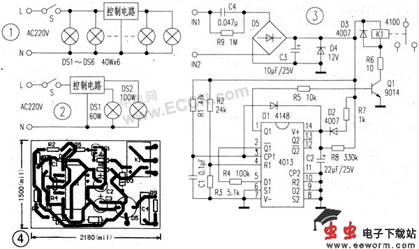C2容量的大小决定了CD4013原状态的有效保持时间。经实验测得,当C2=22μF、第一次关灯与第二次开灯的间隔时间大于8秒时,触发器原状态保持失效,即再次接通开关S时,触发器依然为复位状态,即Q=0,此时的S相当于平时单极开关控制一盏(组)灯:如两次关、开时间间隔小于8秒。则第二次合上S时,触发器上一状态翻转。实验测得,C2=33μF时,12秒内有效,C2:47μF时,18秒内有效,可根据实际需要选取C2。R8是C2两端电压的泄放回路.如脱焊、开路将造成c2两端的电压长时间保持。这主要是CMOS集成电路耗电极微,将使S开、关时不能获得平常单极开关控制单亮的效果。