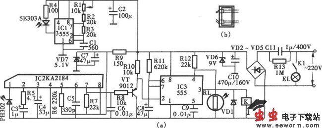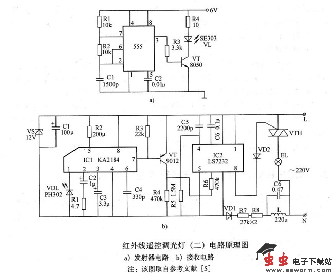 红外线遥控接收电路由KA2184组成。当红外线接收管接收到发射器发出的遥控信号后,经KA2184处理后由7脚输出低电平。这一低电平直接加到VT的基极,使其导通,它的集电极输出的电流在R4上端形成一个高电平输出。这一高电平通过R6加至IS7232调光电路的辅助输入端(6脚),作为调光的控制信号。