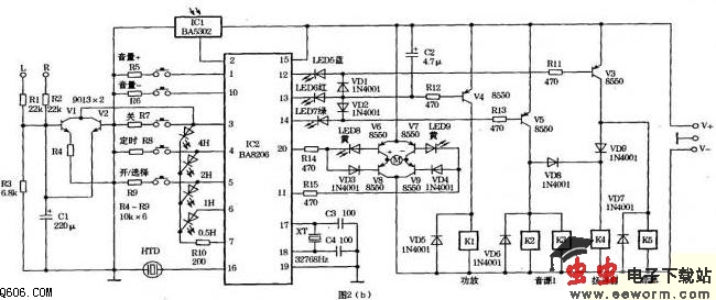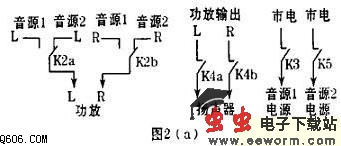 5 开关机场声器保护:每次开机总是IC2第13脚先输出低电平接通功放电源,3秒后再接通所选择的音源1或2,并使K4吸合接通扬声器,避免了开机时对扬声器的电流冲击。关机时第12、13、14脚同时为高电平,但因VD1或VD2的作用,C2充电为低电平,使V4仍导通,使功放电源接通,此时音源1或2及扬声器已断开,同样避免了关机时对扬声器的电流冲击。按图中C2的容值,3秒钟后才使V4截止而关断功放电源。