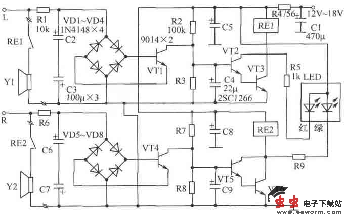 如图所示为扬声器保护电路。它设计为左、右通道独立工作。图中(以左通道为例)的R2、C4及VT2、VT3组成开机延时电路,以防止开机大电流冲击扬声器。