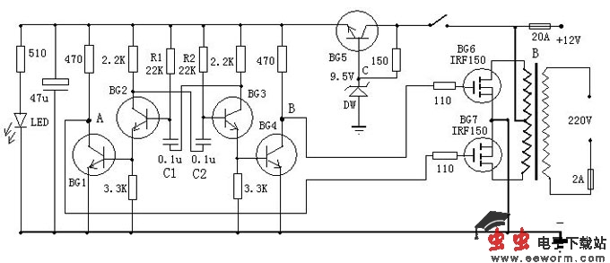 这是一款非常容易制作的逆变器,可以将12V电源电压变为220V市电,电路由BG2和BG3组成的多谐振荡器推动,再通过BG1和BG2驱动,来控制BG6和BG7工作。