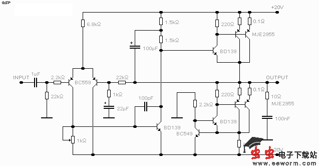 输入级:核心电路是由两只BC559组成的差分放大电路,22K对地电阻为三极管的偏置电阻,它的大小同时决定了整个功放的输入电阻。8.2K电阻是差分对管的公共发射极电阻,决定了差分电路的共模抑制比和本级的静态工作电流。经过输入级放大的电流在流经1K可调电阻时产生的电压信号,直接输送到下一级。 1UF电容是整机的输入电容,其容量的大小和制造材料对音质的影响很大。根据理论计算,1UF的电容与输入电阻22K组成了一个高通滤波电路,它的低端转折频率可以用下式计算:f=1000/(2*3.14*22*1)=7.2HZ。(在过去将放大器的低端频响定位在20HZ时,还是可接受以的。现在数码音源大行其道的今天,看来还是高了一些,低端转折频率定在1HZ以下还是可以接受的。)由于该电容的重要性,一定要选择品质优良的进口音频专用耦合电容,在国产的电容中,新德克的品牌还是值得信任的,经过笔者和朋友的试用,效果令人满意,只是体积稍大了些,在设计电路板时要考虑是否能安装得下。