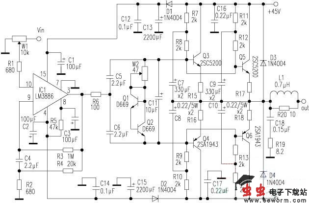 图中,W1为音量电位器,R1为平衡电阻(即匹配电阻),C1、C2为退耦电容,安装时要求靠近LM3886的正负电源的引脚处,否则极易引发低频振荡。D1、D2为隔离二极管,其作用是使大动态性能得以改善。当输出级瞬间大动态信号电流使电源电压下降时,由于D1、D2的反向隔离作用和滤波电容C13、C15上的电压不会突变,LM3886的电源电压便基本保持不变,此时C13、C15相当于一个备用电源向IC1供电,待电容上的电压下滑时,输出级的瞬间电流峰值已过,电源电压复原,接替C13、C15向IC1供电;当动态较小时,IC1的供电仅比电源电压小0.7V,其不良影响完全可以忽略。Q1、Q2、W2构成恒压偏置电路,调节W2可改变输出功率管的静态工作电流。R7与C7、R10与C8、R11与C9、R14与C10分别构成RC滤波器,使输出功率管的基极能获得更纯净和稳定的偏流。R7、R10、R11、R14是隔离电阻,其作用是使C7与C9的正极、C8与C10的负极的电位摆脱电源电压的钳制而处于可浮动状态,以便校正输出功率管的工作状态,改善音质。R15~R17是输出功率管的射极电阻,为输出功率管提供较强的直流负反馈(亦存在交流负反馈),以稳定输出功率管的静态集电极电流,防止热失控。D3和D4为保护二极管,限制输出幅度最大为电源电压,避免了因输出电信号幅度高于电源电压而损坏输出功率管的情况。C18和R19构成贝茹尔网络,用来抵偿扬声器的感抗部分,限制高频输出阻抗,令其保持在8Ω范围内,使功放接近纯阻性,不易自激。R20是阻尼电阻,L1为高频扼流圈,可吸收扬声器产生的反峰电压和抑制超高频电信号送进扬声器。