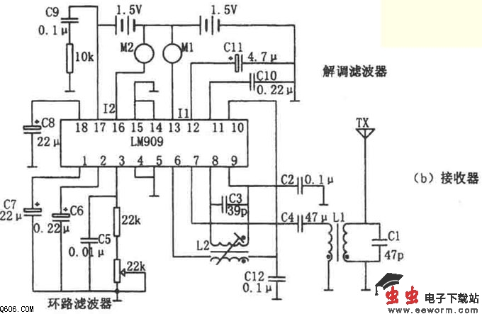 该电路包括发生器和接受器两部分。发射器包括无稳态多谐振荡器(或称占空比发生器)、音频发生器和RF振荡器。接收器主要采用集成电路LM909。