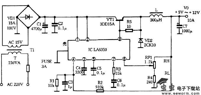 IC为专用开关型稳压集成电路LA6350,其外壳接地并接散热器。R5的功率应大于5W。IC外围电路中,除振荡电容C4选择高频电容器外,电阻R1、R2应选择允许偏差<1%的高精度金属膜电阻外,其余元件无特殊要求,按图中参数选取小型器件即可。由于输出电压为高频开关式,因此IC和功率三极管VT所需的散热器仅为普通稳压电源的三分之一,且性能远远高于普通的稳压电源。