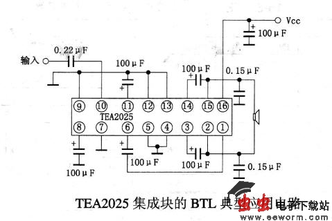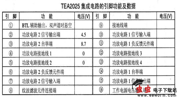 TEA2025集成块的①脚专用于BTL方式时用,当采用双声道方式时,应将其悬空不接。