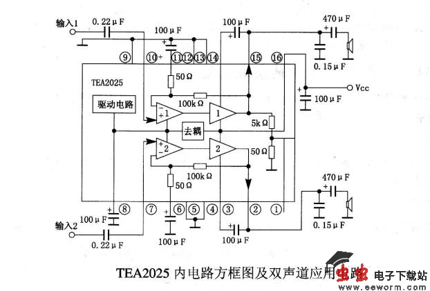 TEA2025集成块内部主要由两路功能相同的音频预放、功放、去耦、驱动电路、供电电路等组成,其集成块的内电路方框图及双声道应用电路如图所示。该IC采用16脚双列直插式封装,其集成电路的引脚功能及数据见表所列。