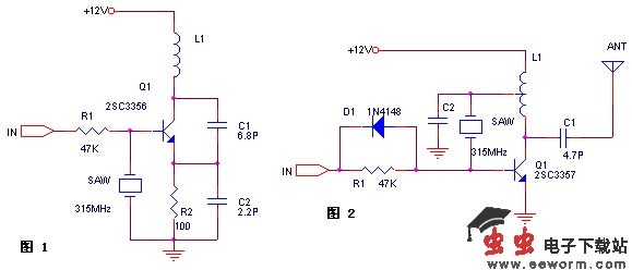 早期的发射机较多使用LC振荡器,频率漂移较为严重。声表器件的出现解决了这一问题,其频率稳定性与晶振大体相同,而其基频可达几百兆甚至上千兆赫兹。无需倍频,与晶振相比电路极其简单。以下两个电路为常见的发射机电路,由于使用了声表器件,电路工作非常稳定,即使手抓天线、声表或电路其他部位,发射频率均不会漂移。和图一相比,图二的发射功率更大一些。可达200米以上。