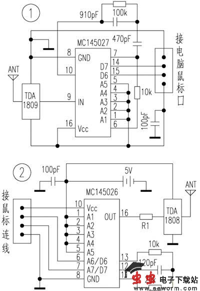 该装置利用编译码电路MC145026/MC145027和射频发射/接收模块TDA1808/TDA1809互相配合,可以在10~120m范围内灵活操纵鼠标,而且制作时无须对原有鼠标的外观及内部电路做任何改动,使用起来符合操作习惯,方便可靠,非常适合爱好者自制。 一般情况下,鼠标与电脑的连接线内部有4根电路连接线(该电路装置最多可以接受4条数据线输入,读者可根据自己鼠标的实际情况选择)分别是电源正极、电源地、数据线1、数据线2。我们将鼠标连线割断,分别找出这4根线,利用MC145026编码电路的数据传送端D6和D7接受鼠标数据线1和数据线2传来的数据,并在芯片内部编码后经射频发射模块TDA1808发射出去。 射频发射模块TDA1809工作后,将接收到的编码信息输入MC145027译码电路,经其转换后在该芯片数据输出端D6和D7复原原鼠标数据线1和数据线2的信号,并通过原鼠标与电脑的连接线送入计算机。 可以看出,上述电路无须改动鼠标及计算机,无须安装额外的鼠标驱动软件,原有鼠标的所有功能亦能正常使用。
