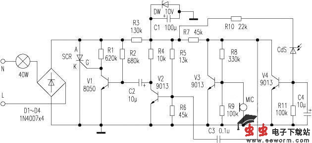 晚上无光照时,光敏元件阻值增大,V4截止,V3集电极电压升高。当MIC拾取到声音后,经V3放大后由C3耦合至V2的基极,声音信号的峰值有可能使V2进入截止区,也可能使V1进入截止区。V1进入截止区后,SCR受触发导通,灯点亮。V2进入截止区后,DW上电压通过R4对C2充电。声音消失后,V2又饱和,C2正极处于地电位,使V1基极为负电位,V1保持截止,SCR保持导通,灯持续点亮。此后C2通过R4、R3、R2放电,放电完毕V1又处于饱和状态,SCR截止,灯熄。调整R2、C2的大小可调整灯亮时间的长短。