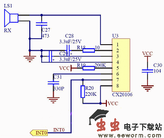 二、CX20106A 的第5脚的电阻决定接收的中心频率,200k的电阻决定了接收的中心频率为40KHz。