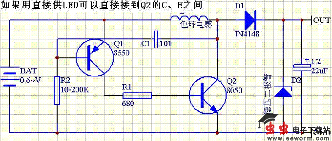 本电路若直接驱动发光管,可以直接把发光二极管的正极接到第二个三极管的集电极,另一端接地,这样可以提高电路的效率。