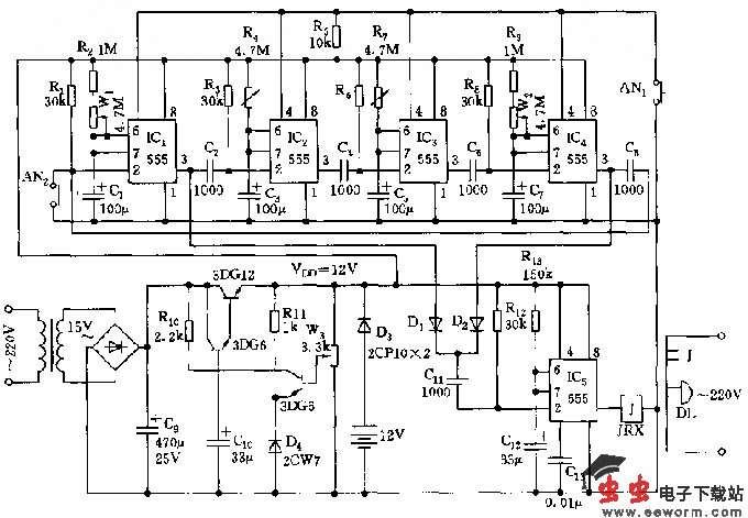 IC5为振铃时间定时控制电路,延时时间td5=1.1R13C12,约为10秒钟环形程序定时器IC1、IC4的输出,加至与门D1、D2,经过C11触发IC5,触发后,3脚呈高电平,将电铃DL电源接通。