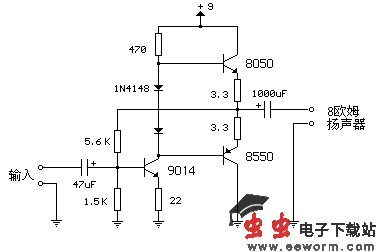 电路如图所示,输入极(9014)的基极工作电压等于两输出极三极管的中点电压,一般为电源电压的一半,这个电压的稳定由输出三极管的基极的两个二极管控制。3.3欧姆电阻串联在输出三极管的发射极上,以稳定偏流。以减小环境温度、不同器件(如二极管、输出三极管)参数区别对电路的影响。当偏流增加时,输出三极管发射极与基极间电压会减小,以减小偏流。此电路输入阻抗为500欧姆,在使用8欧姆扬声器时,电压增益为5。