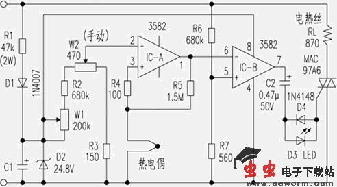 市电AC220V经R1降压、D1半波整流、D2削波稳压、C1滤波后作为比较器件IC的电源电压及调温设定电压源。IC-A③脚为热电偶检测电压输入端(与温度值对应);②脚为调温设定电压。在②、③脚两端电压比较后,由①脚输出。其中R5的作用是将输入的很少一部分反馈至同相输入端③脚,以使在小信号波动时输出锁定不变。当热电偶检到温度偏低时;③脚电平相对②脚低,使输出①脚也低。进而使IC-B放大器⑥脚相对于固定偏置的⑤脚偏低,使输出⑦脚为高。由于IC-B⑤脚电压是由AC220V经R6、R7分压而得,因而,频率、相位完全与AC220V相同。与⑥脚直流比较后在⑦脚输出交流电压。该交流电压经C2、D4、D3和D4反向并联(作用同双向二极管)触发双向可控硅,使相应的电压加到烙铁电热丝上,以达到恒温的目的。