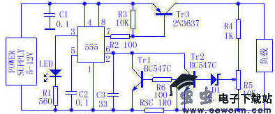 若负载出现过压,则经R4、R5、D1后Tr2导通,也使555触发,Tr3这时也将负载隔离。