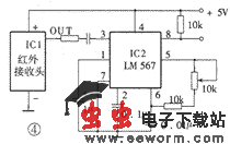 弄清了LM567的基本工作原理和功能后,再来分析图4电路便非常简单了。IC1是红外接收头,它接收发射器发出的红外信号,其中心频率与发射器载波频率f0相同,经IC1解调后,在输出端OUT输出频率为f1的方波信号,也就是与图1中A点波形相同的信号。我们将LM567的中心频率调到与发射器中“与非”门1、2振荡频率相同,即使f2= f1。则当发射器发射信号时,LM567便开始工作,⑧脚由高电平变为低电平,利用这个变化的电平便可去控制各种对象。利用图4的电路,我们可以做成遥控开关,遥控家里的各种家用电器。