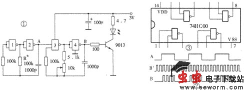单通道红外遥控发射电路如图1所示。在发射电路中使用了一片高速CMOS型四重二输入“与非”门74HC00。其中“与非”门3、4组成载波振荡器,振荡频率f0调在38kHz左右;“与非”门1、2组成低频振荡器,振荡频率f1不必精确调整。f1 对f0进行调制,所以从“与非”门4输出的波形是断续的载波,这也是经红外发光二极管传送的波形。几个关键点的波形如图2所示,图中B′波形是A点不加调制波形而直接接高电平时B点输出的波形。由图2可以看出,当A点波形为高电平时,红外发光二极管发射载波;当A点波形为低电平时,红外发光二极管不发射载波。这一停一发的频率就是低频振荡器频率f1。 在红外发射电路中为什么不采用价格低廉的低速CMOS四重二输入“与非”门CD4011,而采用价格较高的74HC00呢?主要是由于电源电压的限制。红外发射器的外壳有多种多样,但电源一般都设计成3V,使用两节5号或7号电池作电源。虽然CD4011的标称工作电压为3~18V,但却是对处理数字信号而言的。因为这里CMOS“与非”门是用作振荡产生方波信号的,即模拟应用,所以它的工作电压至少要4.5V才行,否则不易起振,影响使用。而74HC系列的CMOS数字集成电路最低工作电压为2V,所以使用3V电源便“得心应手”了。74HC00的引脚功能如图3所示。