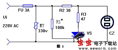 该装置的电路见图1。它是由主要元件—压敏电阻MY和双向可控硅VS组成。MY的主要作用是吸收电网杂波脉冲,防止开机瞬间的大电流冲击,由于它处于彩电电源的第一道关口,有净化电网电源、减小干扰、使屏幕图像更加清晰的功效;VS是电子开关,它能在电网错相时迅速导通产生强大的短路电流使保险丝FU熔断,从而切断供给彩电的电源。具体工作过程如下:当市电电网电压正常时,VS因触发电流不足而处于截止状态,彩电得电而正常工作。一旦发生错相事故,会导致输入电压上升至380V,此时VS迅速被触发导通,在错相的瞬间,由于R2和R3的分压作用, 使输入到彩电中的电压仅为UO=Ui×R3/(R2+R3)≈230(V),这个电压值不会损坏彩电。与此同时,VS的导通会使保护器电路电流猛增,FU迅速熔断而切断电源。