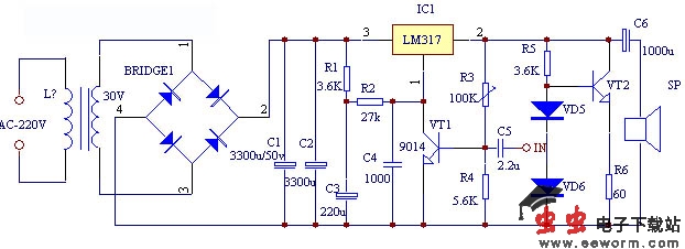 三端稳压IC选取LM317,三极管VT1选取9014。VT2选用8050型,二极管VD5、VD6选用2CP20,变压器的功率应大于50W。