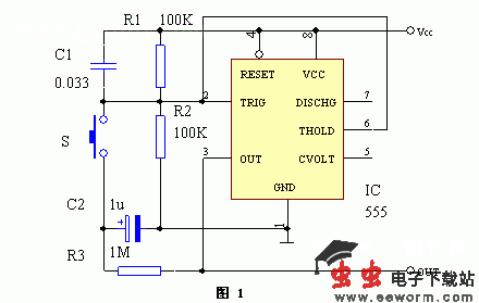 电路刚通电时,C1的存在使IC(555)⑥脚获得一正脉冲,其③脚输出低电平,此时C2上无电压。按一下轻触键S,C2上“0”电平作用于IC的②脚,③脚翻转为高电平,通过R3对C2充电。S释放后,C2充电到Vcc,而IC的②、⑥脚被R1、R2偏置于1/2Vcc,③脚高电平状态保持不变。再按一下S,C2上电压使IC⑥脚电压大于2/3Vcc,③脚又翻转为低电平。S释放后,C2上电压通过R3、IC③脚放电,②、⑥脚的电压仍为1/2Vcc,③脚低电平的状态可维持不变。由此可见,每按S一次,IC③脚高、低电平就变换一次。