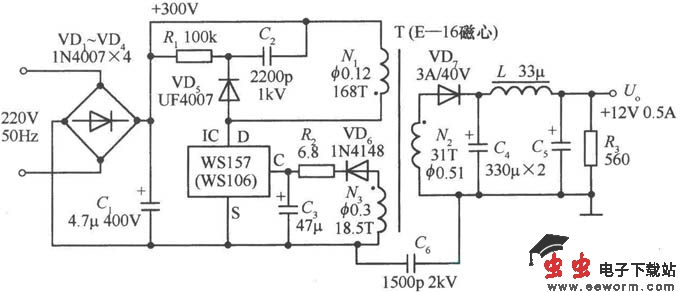 接通电源后,220V交流电首先经过桥式整流和C1滤波,得到约+300V的直流高压,再通过高频变压器的初级线圈N1,给WSl57提供所需的工作电压。从次级线圈N2上输出的脉宽调制功率信号,经VD7、C4、L和C5进行高频整流滤波,获得+12V、0.5A的稳压输出。反馈线圈N3上的电压则通过VD6、R2、C3整流滤波后,将控制电流加至控制端C上。由VD5、R1,和C2构成的吸收回路,能有效抑制漏极上的反向峰值电压。该电路的稳压原理分析如下:当由于某种原因致使Uo↓时,反馈线圈电压及控制端电流也随之降低,而芯片内部产生的误差电压Ur↑时,PWM比较器输出的脉冲占空比D↑,经过MOSFET和降压式输出电路使得Uo↑,最终能维持输出电压不变。反之亦然。
