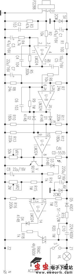 由于C8所储电能通过R15、VR2放电需时约2分钟,故在此2分钟内灯一直亮着。当C8上的电压低于{13}脚电压(1V)时,{14}脚无输出,可控硅关闭,灯自动熄灭。