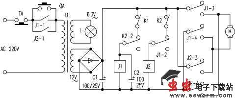 电源变压器B、桥式整流堆和电容C1组成12V直流电源。继电器J1、J2和行程开关K1、K2组成互锁电源极性切换电路。