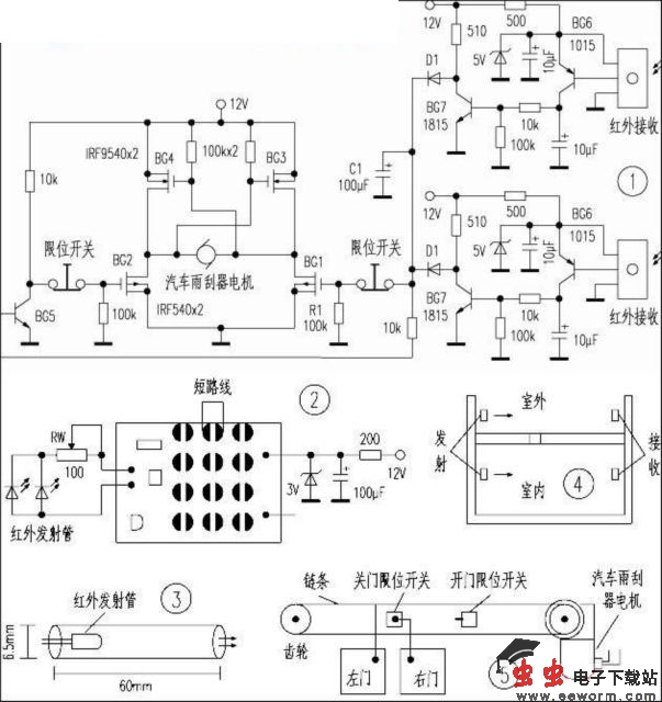 图1是红外接收和电机驱动电路,在无人的时候红外接收器正常接收来自另一侧发过来的红外光束。用60mm长刚好插入红外发射管的导向管(图3)在墙壁上平行固定,高度适当,并和对面的接收器对准,这样发出的红外线是一束,不易干扰另一个接收器。具体安装方法见图4所示。经BG6、BG7、CR等放大滤波后输出低电平,此时BG5截止,BG2、BG3导通执行关门动作。当人走到门口时,红外光被挡住,BG7输出高电平经一路限位开关驱动BG1、BG4执行开门动作,另一路经R1驱动BG5使BG2关断,当门开到指定位置时开门限位开关断开,使电机不再继续运转。当人离开时,BG7不再输出高电平,经电容C1延时三秒钟后执行关门动作。