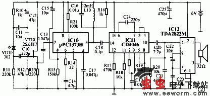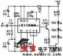 接收与发射电路中两只CD4046的中心频率均为45kHz,故R7与R17、R8与R18、C4与C24的参数必须严格对应相等。驱动红外发光管的三极管VT1与VT2均工作在放大状态,其Vbe约0.6V;VT1与VT2也可用9013替换,但管子的β应大于100。发射电路的电源在图中没有标出,制作时可用LM7806稳压后获得。