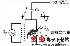 经两级放大的音频信号直接耦合到由VT3、T构成的消侧音电路。在VT3的射极回路中接有消侧音变压器T的初级线圈,C6为高频旁路电容。射随电路输出阻抗低,输入阻抗高,且信噪比高,同时消侧音较为彻底。“侧音” 是指在双工通话时,本方的受话器(扬声器或耳机)中,听到自己的声音,这种声音形成电声反馈,就会干扰正常的通话。因而在电话电路中,应尽量减少侧音干扰。与之相应的电路称为消侧音电路。图2是本文消侧音电路的等效电路,射随器相当于一个低内阻的信号源,设该信号源为正弦波交流信号,经电磁耦合,在T的次级产生大小相等,相位相反的两个正弦波信号,这两个信号加在负载电位器RP2的两端,调节RP2的动端A,使其正弦波在A点的合成输出为零。这样,加在T初级的信号就不能由A端进入到本方的功率放大电路。而只能经耦合电容C7向对方输送。同理,由对方消侧音电路送来的信号就可经A端进入本方的功率放大电路。[!--empirenews.page--]