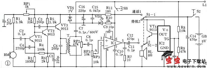BM采用驻极体话筒,其电声性能优良,需对内置场效应晶体管提供工作电压。图1中R1、RP1、C1组成话筒供电电路。C1为滤波电容;调节RP1可改变话筒拾音灵敏度。