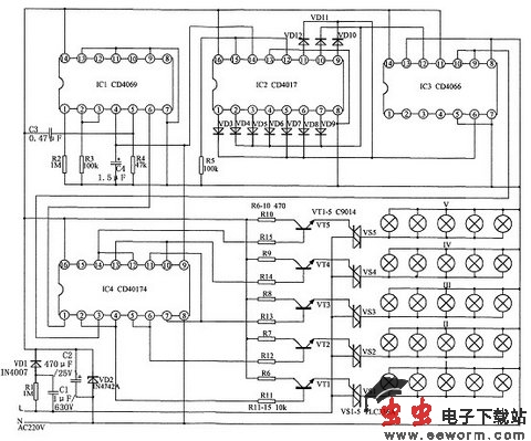 二维彩灯控制器电路如图1所示,主要由非门IC1(CD4069)、计数/时序分配电路IC2(CD4017)、模拟电子开关IC3(CD4066)及D触发IC4(CD40174)等组成。