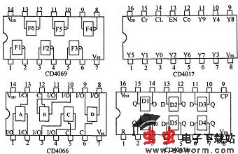 CD4069为CMOS数字集成电路,是一种高输入阻抗器件,容易受外界干扰造成逻辑混乱或出现感应静电而击穿场效应管的栅极。虽然器件内部输入端设置了保护电路,但它们吸收瞬变能量有限,过大的瞬变信号和过高的静电电压将使保护电路失去作用,因此,CD4069中未使用的非门F4、F5、F6的输入端{9}、{11}、{13}脚均接到Vss接地端,以作保护。