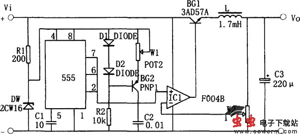 如图所示为用555构成的升压型开关稳压电源电路。电路中,采用晶体管BG1作为开关调整管;运算放大器IC1构成比较放大器;555时基电路接成无稳态多谐振荡器。振荡器在C1上产生锯齿波电压(Vmin=1/3Vz,Vmax=2/3Vz,频率由W1和C1确定)送至比较器IC1的同相输入端,取样电压送至比较器的反相输入端。IC1输出矩形波形的占空比由取样电压控制,在输出电压为一稳定值时,取样电压为1/3Vz和2/3Vz之间某一值。当某种原因使输出电压上升(或下降)时,取样电压随之上升(或下降),使IC1输出矩形波占空比减小(或增大),导通时间减短(或增加),输出电压下降(或上升),从而达到稳定输出电压的目的。调整W,可控制输出电压的大小。