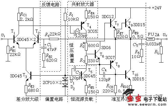 电路结构:T1、T2为差放输入级,T4为共射放大级和T7~T9、T8~T10组成准互补功率输出级。