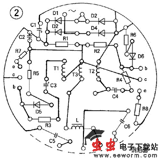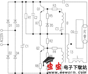 5.若高频变压器B损坏,可用∮0.32mm高强线在10mm×6mm×5mm的高频磁环上绕制,T1、T2各为4圈;T3为8圈(注意头尾)。扼流圈L:灯管功率5~40W,相应为1.5~5.5mH之间。