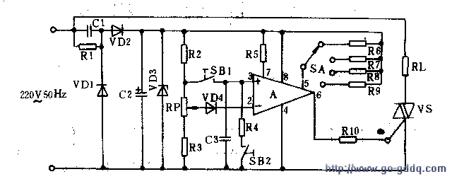 工作原理如图所示。图中,SBl为起动开关,sB2为停止开关。当按下起动开关SB1后,直流电源经R2对电容c3充电,集成运算放大器A同相输入端3的电位高于反相输入端2,A输出高电位去触发双向晶闸管VS,使V5导通。交流电源经VS加至用电负载,定时供电开始。当释放SBl后.C3经A同相输入端放电,放电时间的长短决定于c3的容量和电阻R6一R9的阻值大小以及A反向端②电位的高低。当c3电位下降至反向端电位以下时,A输出接oV,v5无控制电压而截止,定时供电结束。