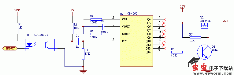 如下图:电路工作的时候只要定时给CD4060复位脉冲,就能保证Q1处于截至状态,从而使受控的NMOS管处于导通状态给处理器电路系统供电。