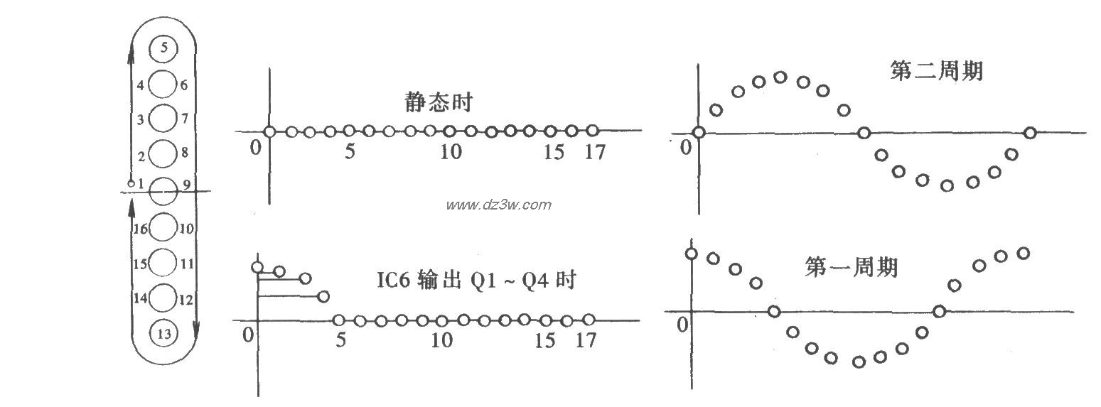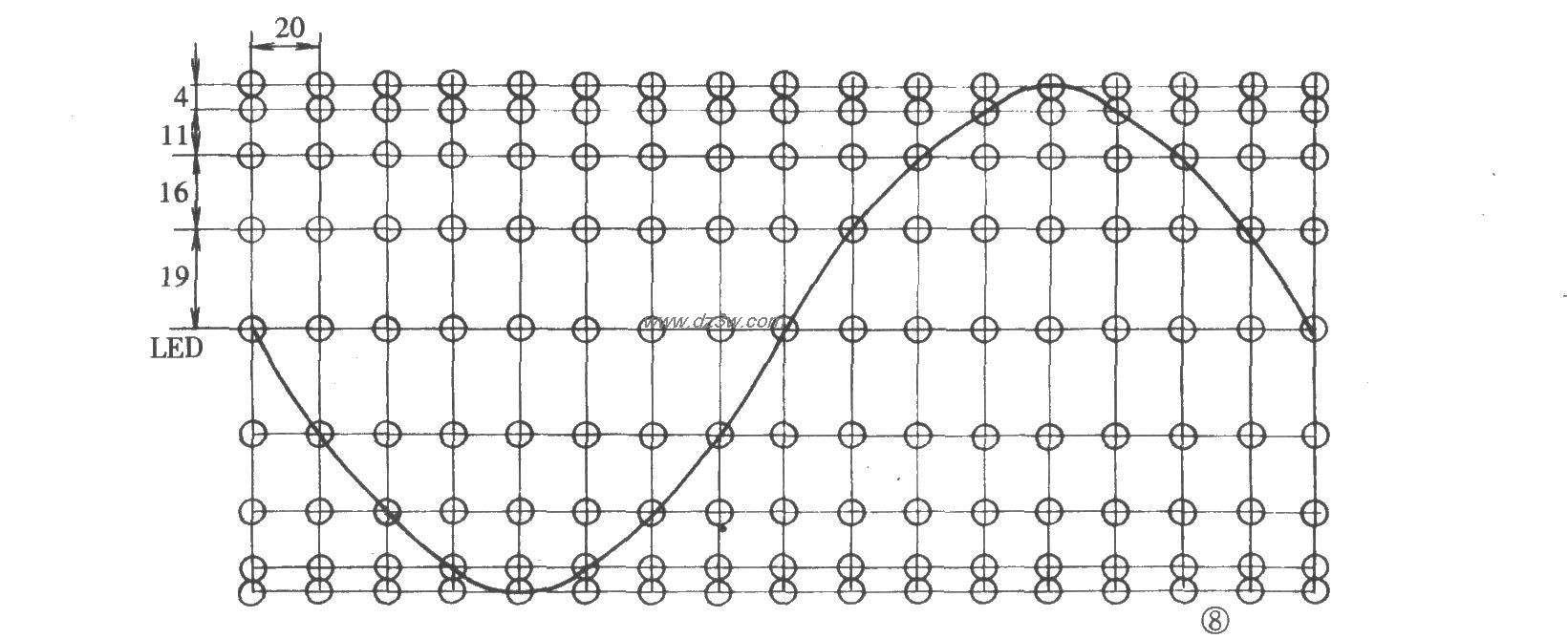简谐振动波演示器(CD4043、CD4017、LM7812、NE555) 如图所示的简谐振动波演示器电路可一演示简谐波的产生与传播过程,介质质点振动的周期、方向与波的传播周期和方向的关系。电路由驱动脉冲发生电路、水平扫描电路、垂直扫描电路、演示显示电路和电源电路组成。 发光二极管显示阵列: 扫描电路的输出显示顺序: