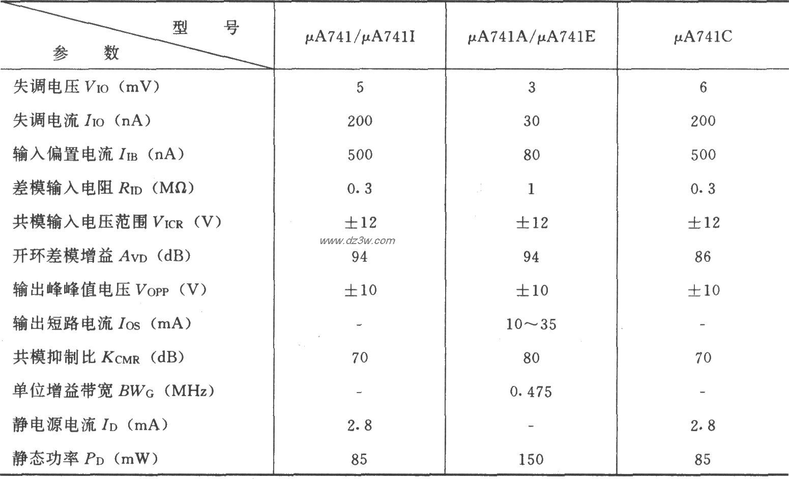 μA741电特性数据表(VD=±15V;TA=25℃)