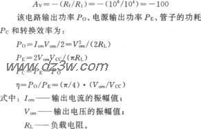 通常的运放其输出电流约为10~30mA。对于由μA741组成的运算放大电路,当输出电流大于10~35mA左右时,其输出电压将出现限幅现象,即此时的输出电压将出现较大的失真。当需要输出较大电流时,可采用由2SC503和2SA503组成的对管。所谓对管即其输入、输出特性近于完全相同的晶体管,使用时,应严格选择,不可随意配用。这个电路的输出电流可达120mA,电压放大倍数约为: