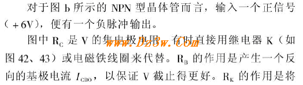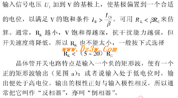 晶体三极管管反相器电路图 晶体管反相器是最基本的常用开关电路,如图 44 所示。 工作原理:当无输入信号时,以图a为例,+EB通过RB加到晶体管V的基极上,V截止,管子内儿乎没有电流通过,RC上的压降接近于零,因而V集电极输出端电位近似为-Ec.当输入端加一负的信号电压,例如一 6v 时, v 由截止过渡到饱和,此时输出端电位近似为零,这个信号-直保持至一 6V 信号消失为止。