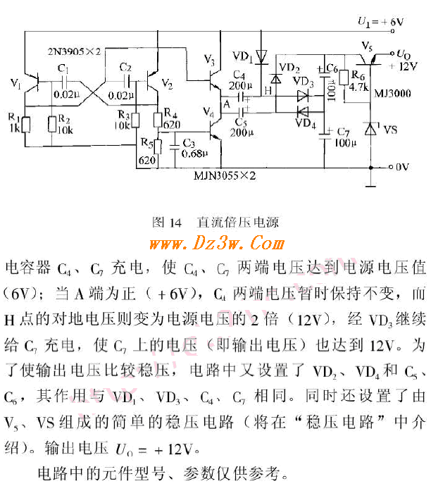 直流倍压电源 直流倍压电源不用变压器,它能将直流电压直接升高-倍左右,而且能输出较大的功率( 5W 左右),电路如图 14 所示。