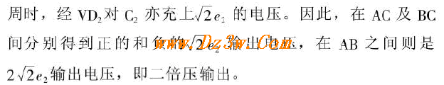 二倍压整流电路图 本例介绍二倍压整流电路,如图 6 所示。本例是利用一组绕组、两只整流二极管,可获得三组不同输出电压的整流电路。 如果电容较大,并且负载电阻RL也很大的话,当e2正半周时,可以认为经过整流二极管VD1对C1充上√2e2的电压而基本保持不变。同样,当e2负半