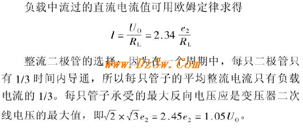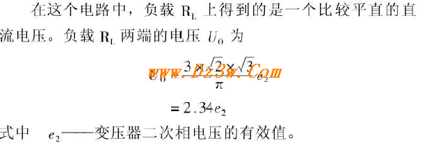 三相桥式整流电路 三相桥式整流电路如图 4 所示。 T 为变压器,一次、二次绕组都接成星形(丫)。 在这个电路中,负载 RL上得到的是一个比较平直的直流电压。负载RL两端的电压U0为