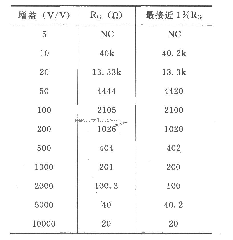 如图所示为INA122的信号和电源的基本连接电路。在噪声环境或高阻电源应用时,芯片电源端要用电容滤波,且应尽可能靠近芯片电源脚放置。基准端必须是低阻连接,如有10Ω串联电阻,则共模抑制比将下降约80dB(G=1)。增益与RG的选择如下表所示。增益G=5 200kΩ/RG,公式中200kΩ等于INA122内部两个反馈回路电阻之和。内部两个反馈电阻是经过激光校正的,因此外部电阻RG的选用对增益影响就很大,应选用稳定性好、温度漂移小的电阻。