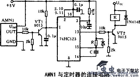 一种带定时器的控制电路如图所示。定时时间取决于RC的乘积。此电路当检测到人体时,VT2导通,继电器吸合。